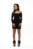 THE MYSTYLEMODE BLACK DOUBLE LINED OFF THE SHOULDER ELBOW CUT OUT MINI DRESS