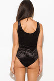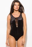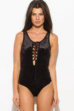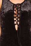 FINAL SALE-MYSTYLEMODE BLACK CRUSHED VELVET DEEP V NECK LACEUP SLEEVELESS BODYSUIT TOP