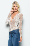 THE MYSTYLEMODE CHAMPAGNE CRUSHED VELVET PLUNGING V NECK LONG SLEEVE BODYSUIT