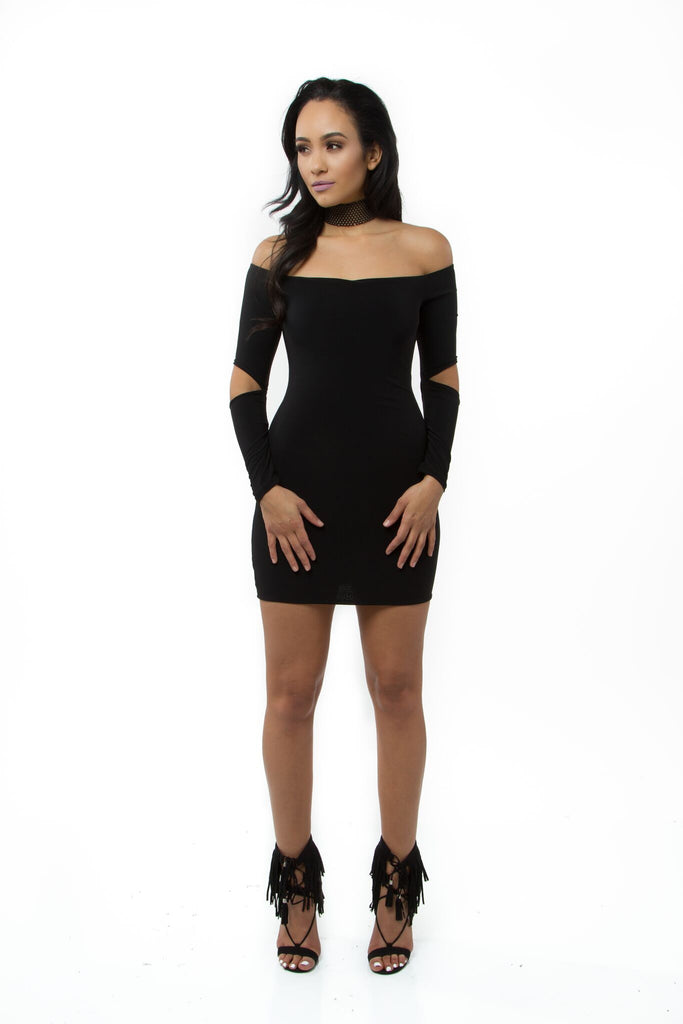 THE MYSTYLEMODE BLACK DOUBLE LINED OFF THE SHOULDER ELBOW CUT OUT MINI DRESS