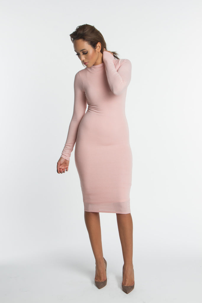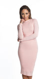 THE MYSTYLEMODE DUSTY PINK DOUBLE LINED LONG SLEEVE FUNNEL NECK MIDI DRESS