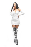 What is not to love about our new mini that combines comfort and on point design. Our new mini is made of super stretchy, yet oh so comfortable material that will hug all your curves and still give that extra comfort to wear all day. The dress features long sleeves with an off the shoulder design to show off just enough skin, a deep structured V neck, and the unique frayed edges gives it that extra edge. This dress will show off and accentuates your silhouette, while being the perfect piece to add that little bit of extra to your wardrobe.