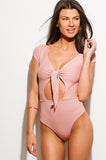 DUSTY PINK RIBBED KNIT CUT OUT CAP SLEEVE FRONT TIE BODYSUIT TOP