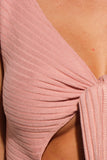 This ribbed knit cut out bodysuit top adds a little unexpected sexiness to your everyday look. Dusty blush pink, ribbed knit is perfectly stretchy across a sexy cut out center and cap sleeves with a v neckline that is tied together with flyaway straps. Fitted bodice ends in brief bottoms with two snap closures