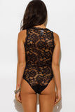 Sheer lace sleeveless bodysuit with snap button closure is a show stopper. Perfect sexy piece to add to your wardrobe. You will be sure to spice things up with this statement piece.